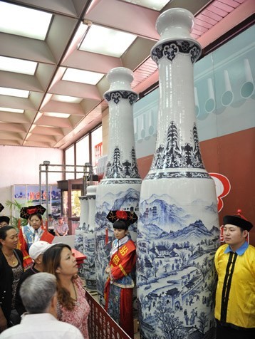 8月22日,中國(guó)(太原)煤炭博物館展示了一對(duì)名為“天下晉商”的陶瓷酒瓶。這對(duì)酒瓶榮獲了“大世界吉尼斯之最——最高的陶瓷酒瓶”,瓶身總高達(dá)3.93米,肚徑達(dá)0.93米,該陶瓷瓶運(yùn)用青花料色在泥坯上繪制山西古建筑、自然風(fēng)光、人文景觀等圖案,經(jīng)1330℃高溫?zé)贫伞?/FONT>